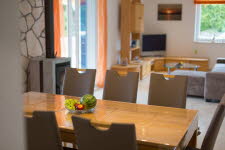 Eine Gästetoilette, ein offenes Wohnzimmer (ca. 40 qm) mit Ausziehcouch, eine offene modern ausgestattete Küche (u.a. mit Waschmaschine, Spülmaschine), ein Weinkühlschrank mit lokalen / internationalen Weinen zum Selbstkostenpreis und einem großen Esstisch mit ausreichend Platz für 8 Personen laden zu einem entspannten Urlaub ein.